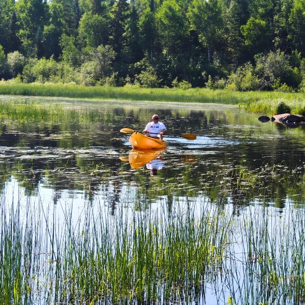 For something a little more secluded, paddle the stream that cuts through the resort as it leads toward the Rennie River. Just below the little falls, the stream widens into a navigable stretch that’s perfect for canoeing and kayaking. Downstream, you may spot deer along the banks, a busy beaver at work, or even a blue heron standing quietly in the shallows.