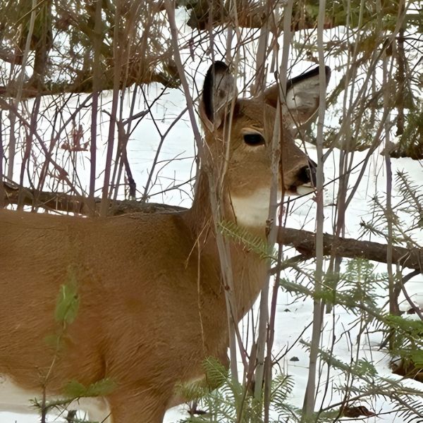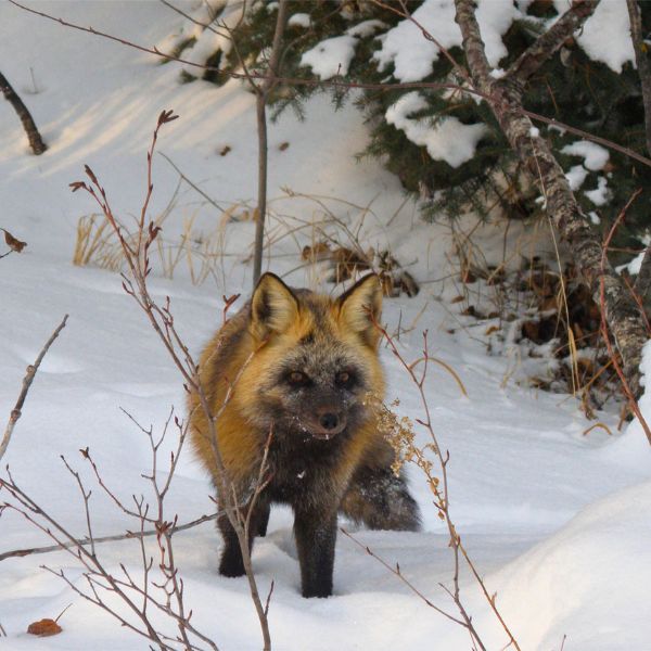 White-tailed deer and foxes are commonly seen moving along the forest edge and across the frozen lake. Ravens and eagles soar overhead, while owls are sometimes heard or spotted during quieter parts of the day.